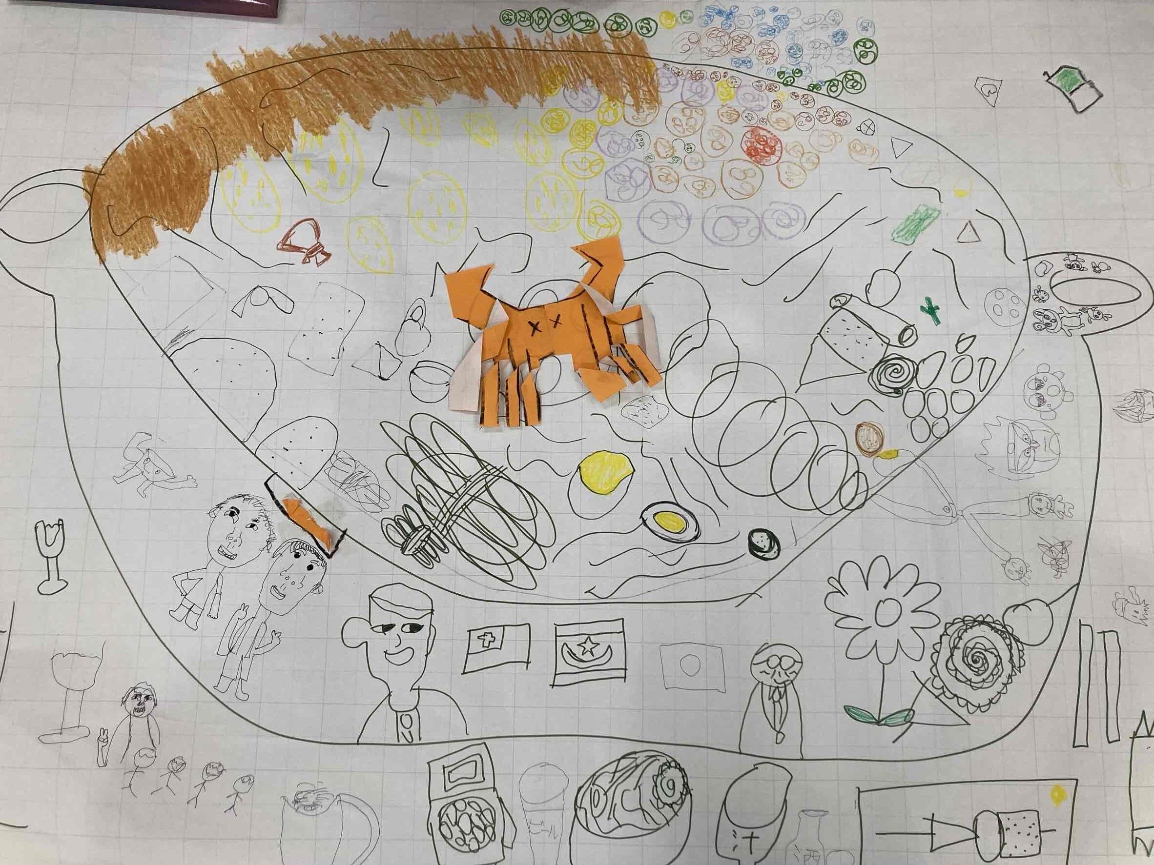 トランポリンや吊り遊具で体を動かした後、大きな模造紙にみんなでお絵かきをしました。テーマは、おでんの具材で何が好き?